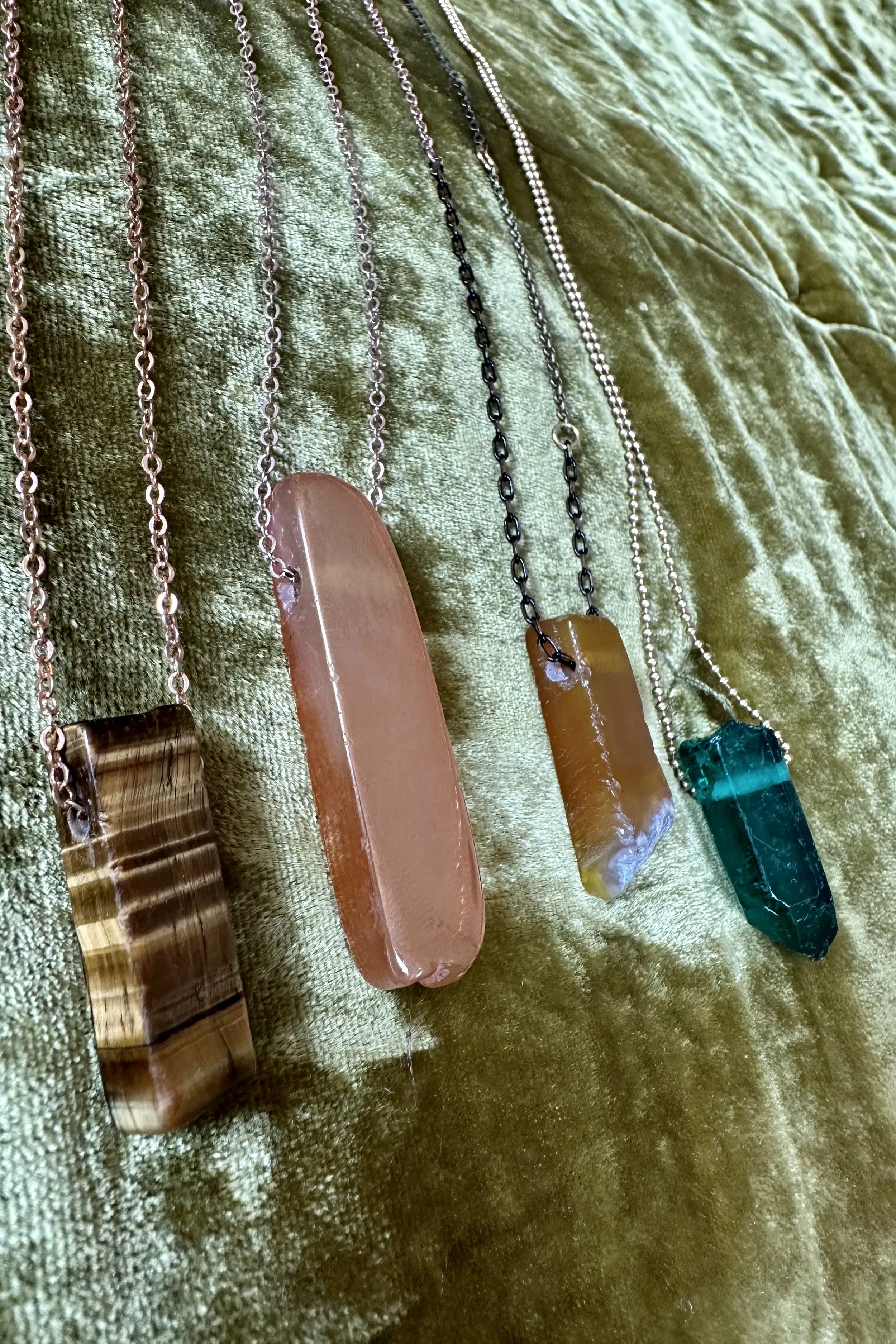 Archives › 4 Stone Layering Necklaces; Peach Quartz, Yellow Agate, Green Agate, Tiger Eye Image 1 of 8 Image 2 of 8 Image 3 of 8 Image 4 of 8 Image 5 of 8 Image 6 of 8 Image 7 of 8 Image 8 of 8 4 Stone Layering Necklaces; Peach Quartz, Yellow Agate, Green Agate, Tiger Eye $85.00 sold out Sold Out Added!