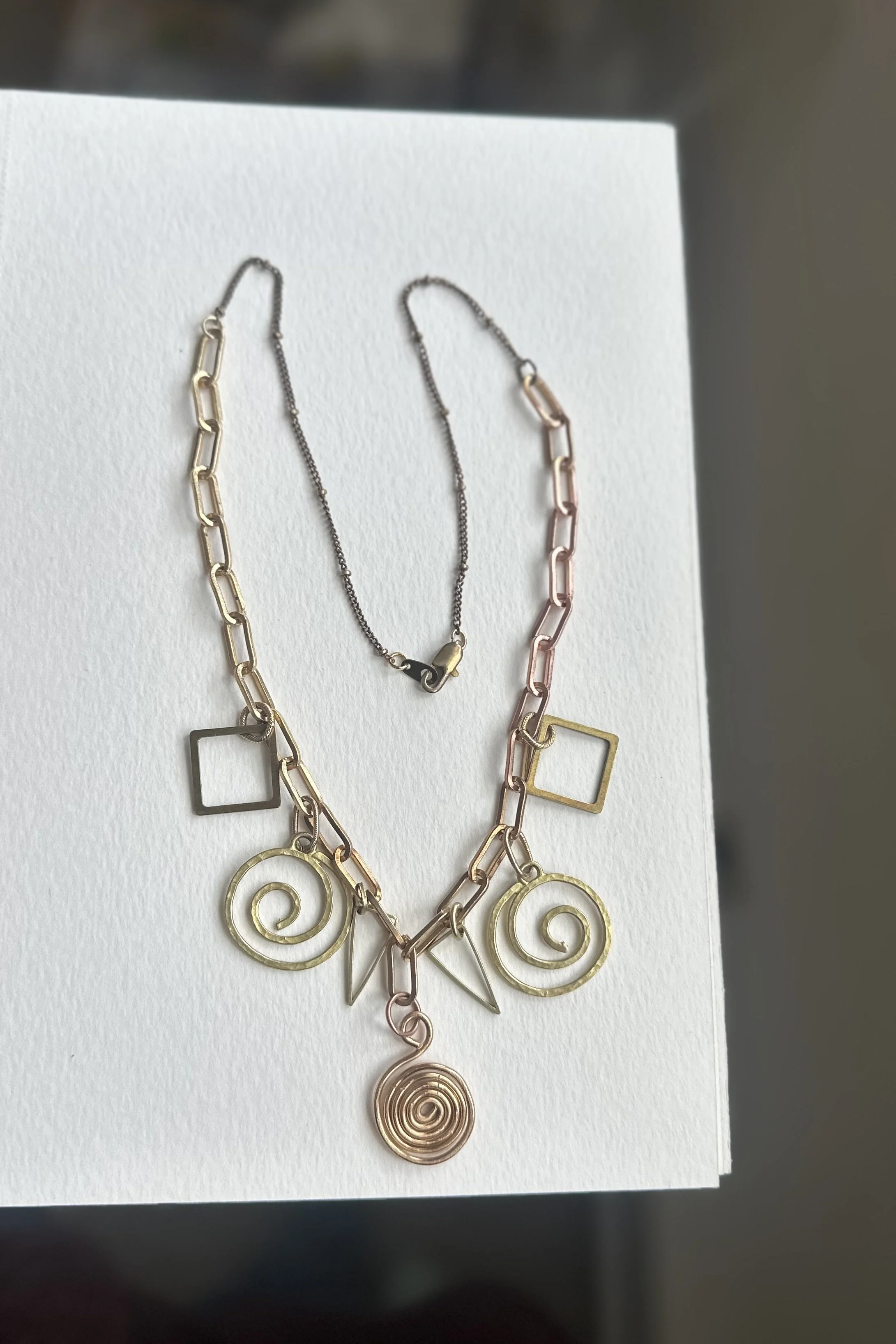 Archives › brass spiral and shapes charm chain Image 1 of 6 Image 2 of 6 Image 3 of 6 Image 4 of 6 Image 5 of 6 Image 6 of 6 brass spiral and shapes charm chain $74.00 sold out Sold Out Added!