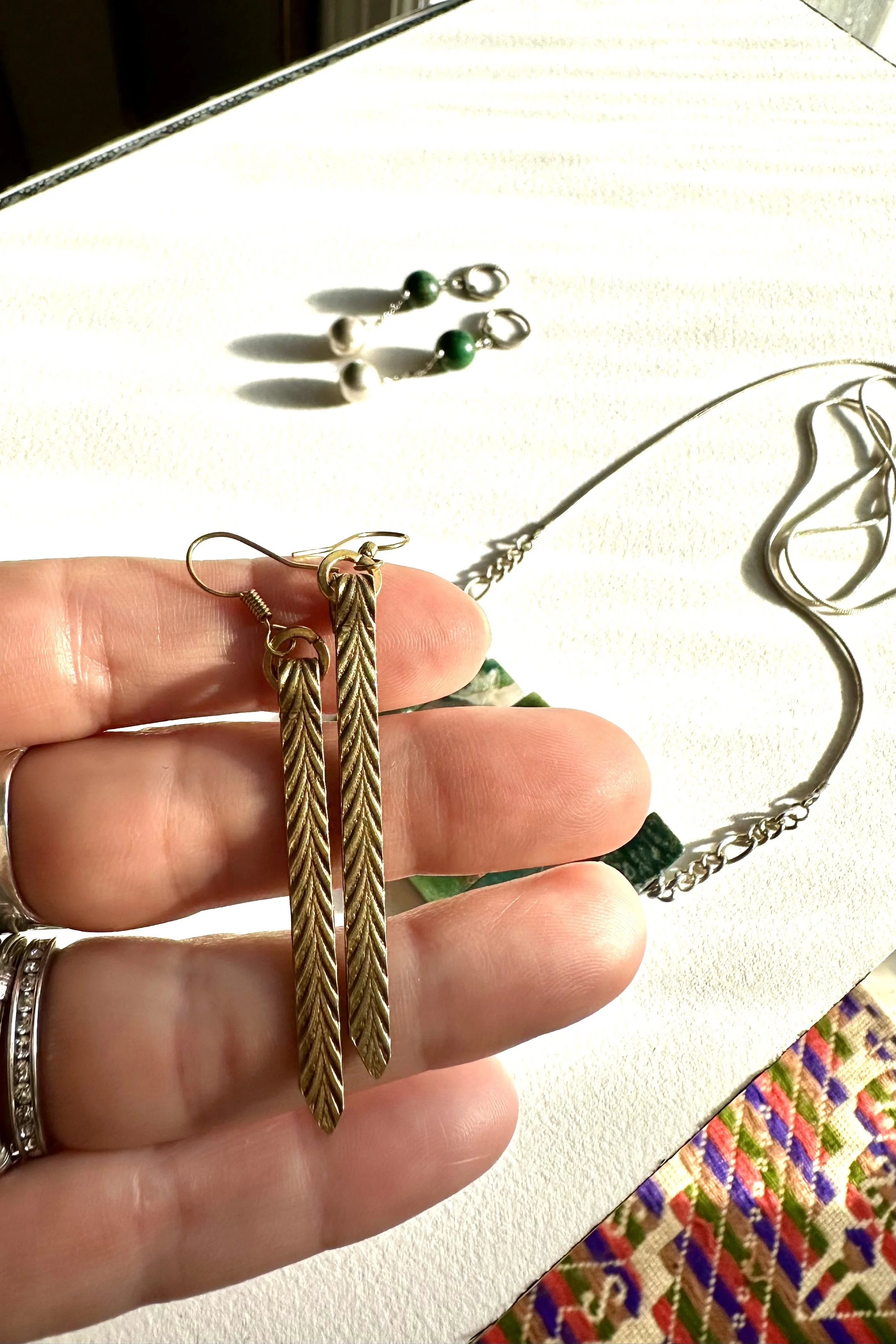 Archives › Brass Textured Blade Drops Image 1 of 5 Image 2 of 5 Image 3 of 5 Image 4 of 5 Image 5 of 5 Brass Textured Blade Drops $40.00 sold out Sold Out Added!