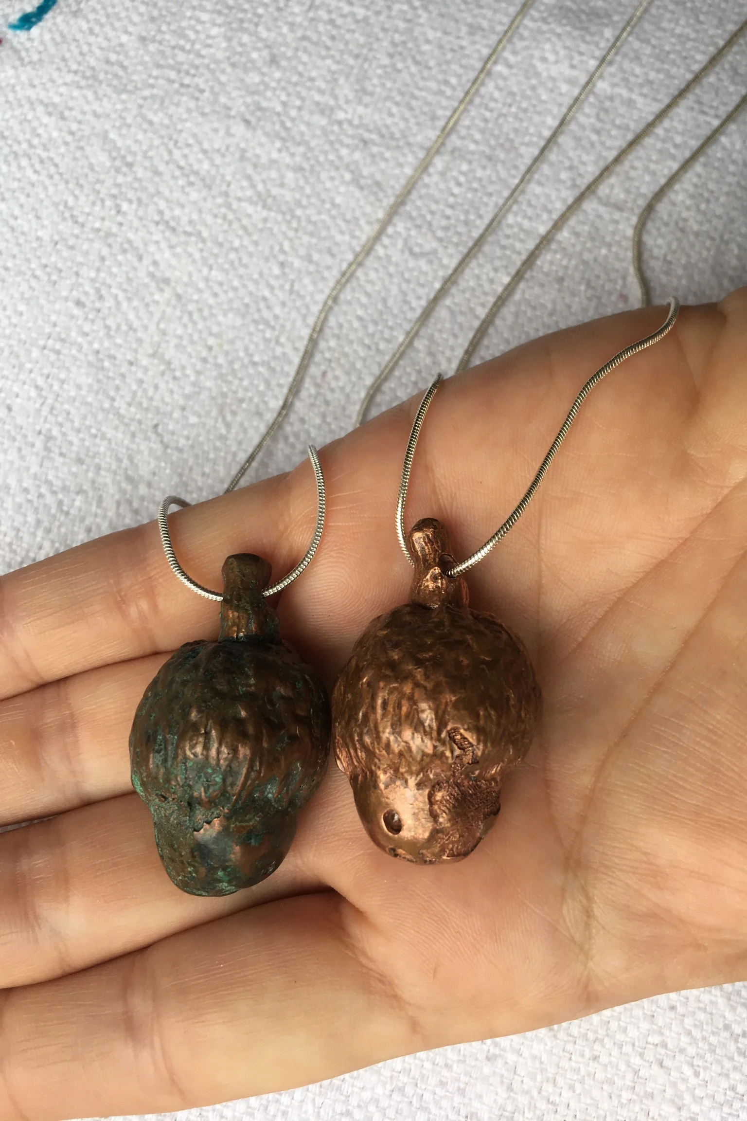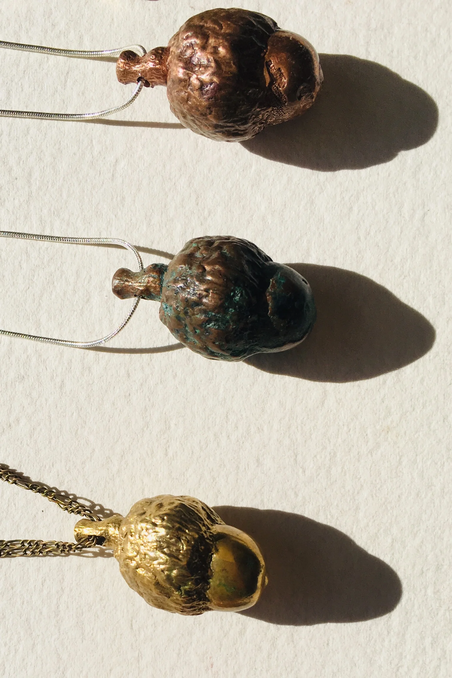 Solid heavy brass acorn pendant made from California found acorn. Texture and detailing in natural configuration. Each piece is a new casting and comes on a mixed chain. Chain will vary. Pictured chain length is 26".