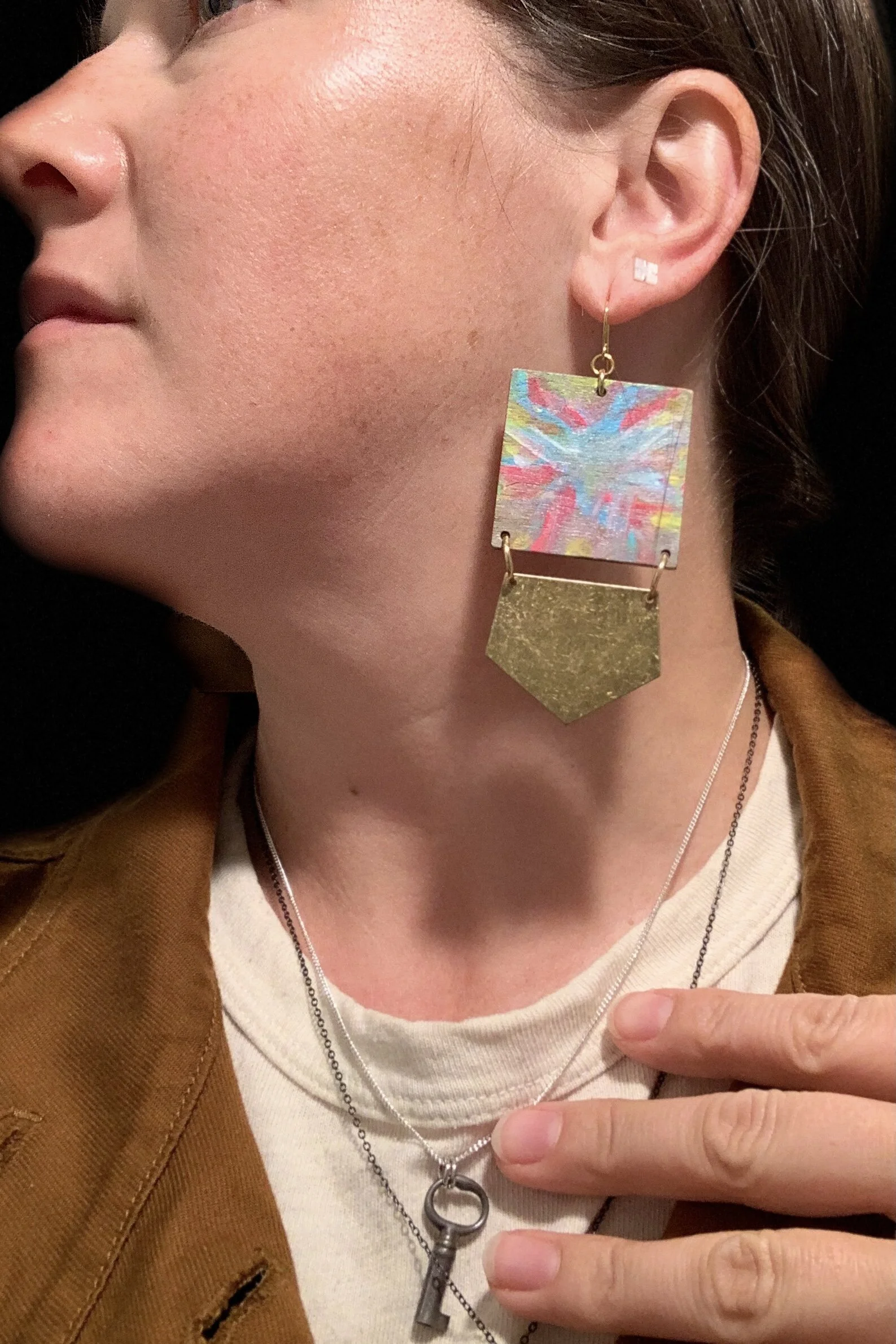 Archives › HAND PAINTED BURSTS WITH BRONZE PLATE DANGLE Image 1 of 4 Image 2 of 4 Image 3 of 4 Image 4 of 4 HAND PAINTED BURSTS WITH BRONZE PLATE DANGLE $50.00 sold out Sold Out Added!