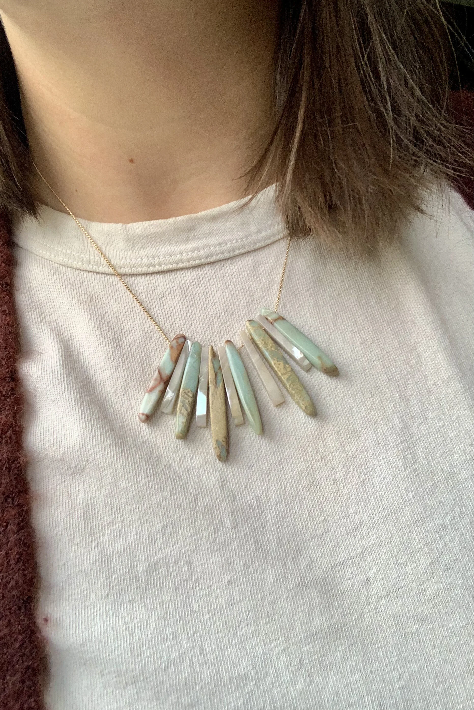 Archives › PEARL AND AQUA TERRA JASPER FAN NECKLACE Image 1 of 6 Image 2 of 6 Image 3 of 6 Image 4 of 6 Image 5 of 6 Image 6 of 6 PEARL AND AQUA TERRA JASPER FAN NECKLACE $46.00 sold out Sold Out Added!