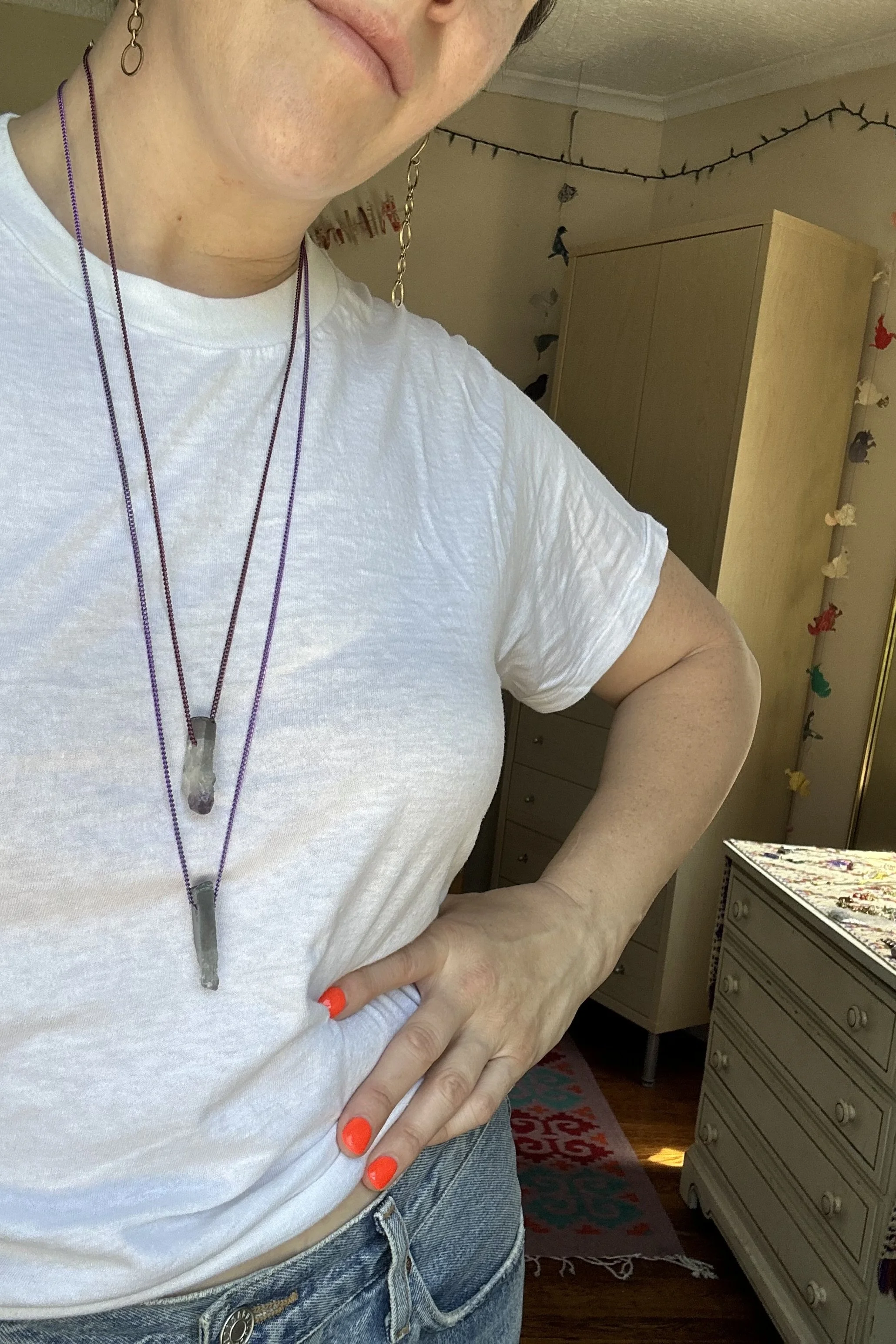Archives › purple metallic chains amethyst druzy bar layering necklaces Image 1 of 6 Image 2 of 6 Image 3 of 6 Image 4 of 6 Image 5 of 6 Image 6 of 6 purple metallic chains amethyst druzy bar layering necklaces $60.00 sold out Sold Out Added!