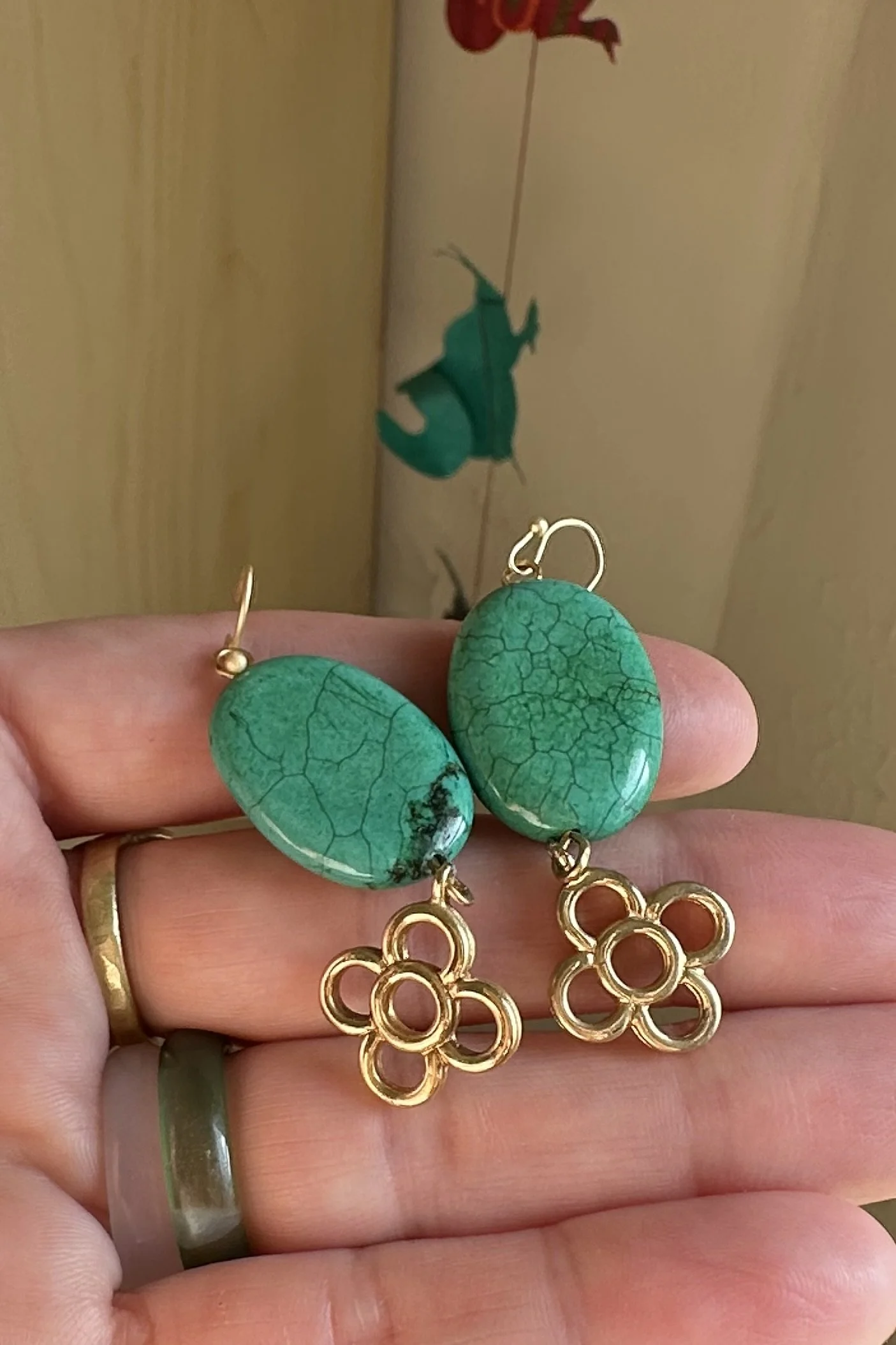 Archives › turquoise and golden flower drop earrings Image 1 of 5 Image 2 of 5 Image 3 of 5 Image 4 of 5 Image 5 of 5 turquoise and golden flower drop earrings $50.00 sold out Sold Out Added!