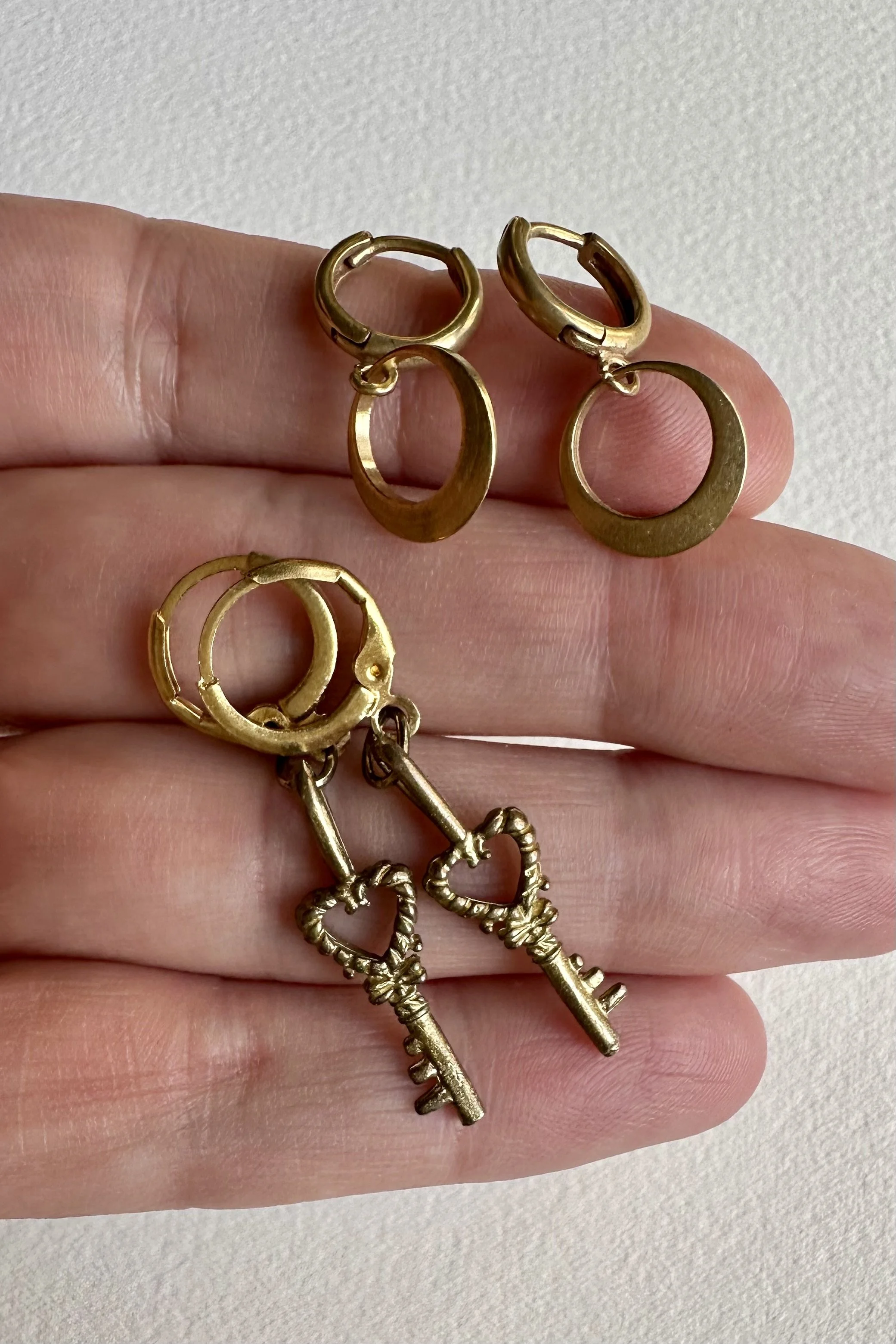 Archives › two pairs little brass huggie hoops: keys and discs Image 1 of 5 Image 2 of 5 Image 3 of 5 Image 4 of 5 Image 5 of 5 two pairs little brass huggie hoops: keys and discs $44.00 sold out Sold Out Added!