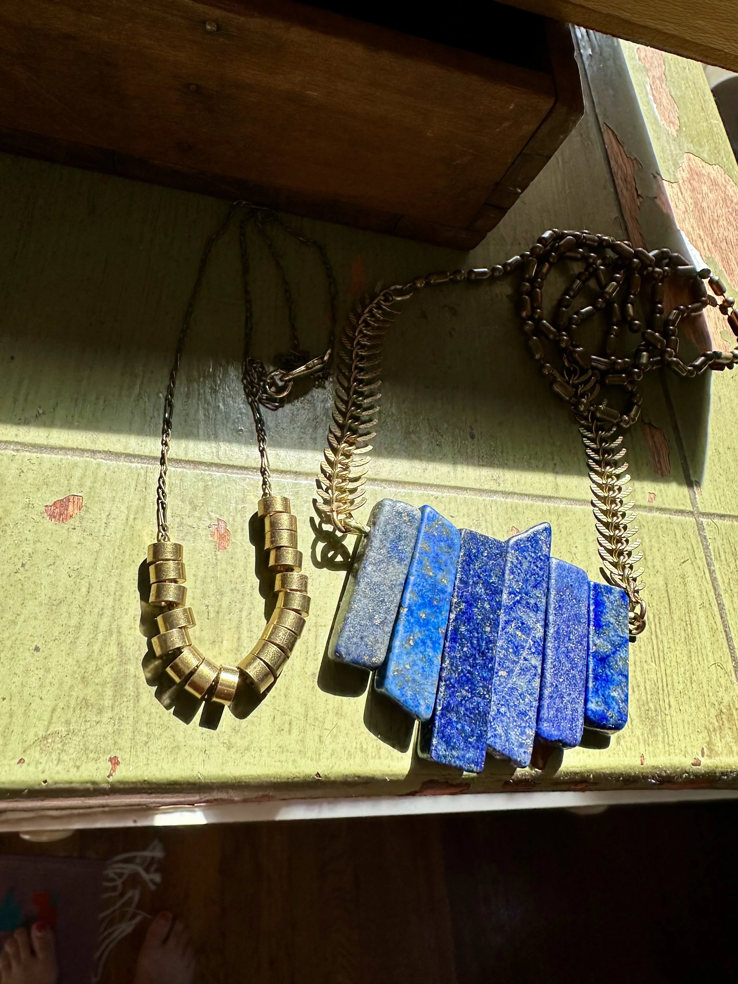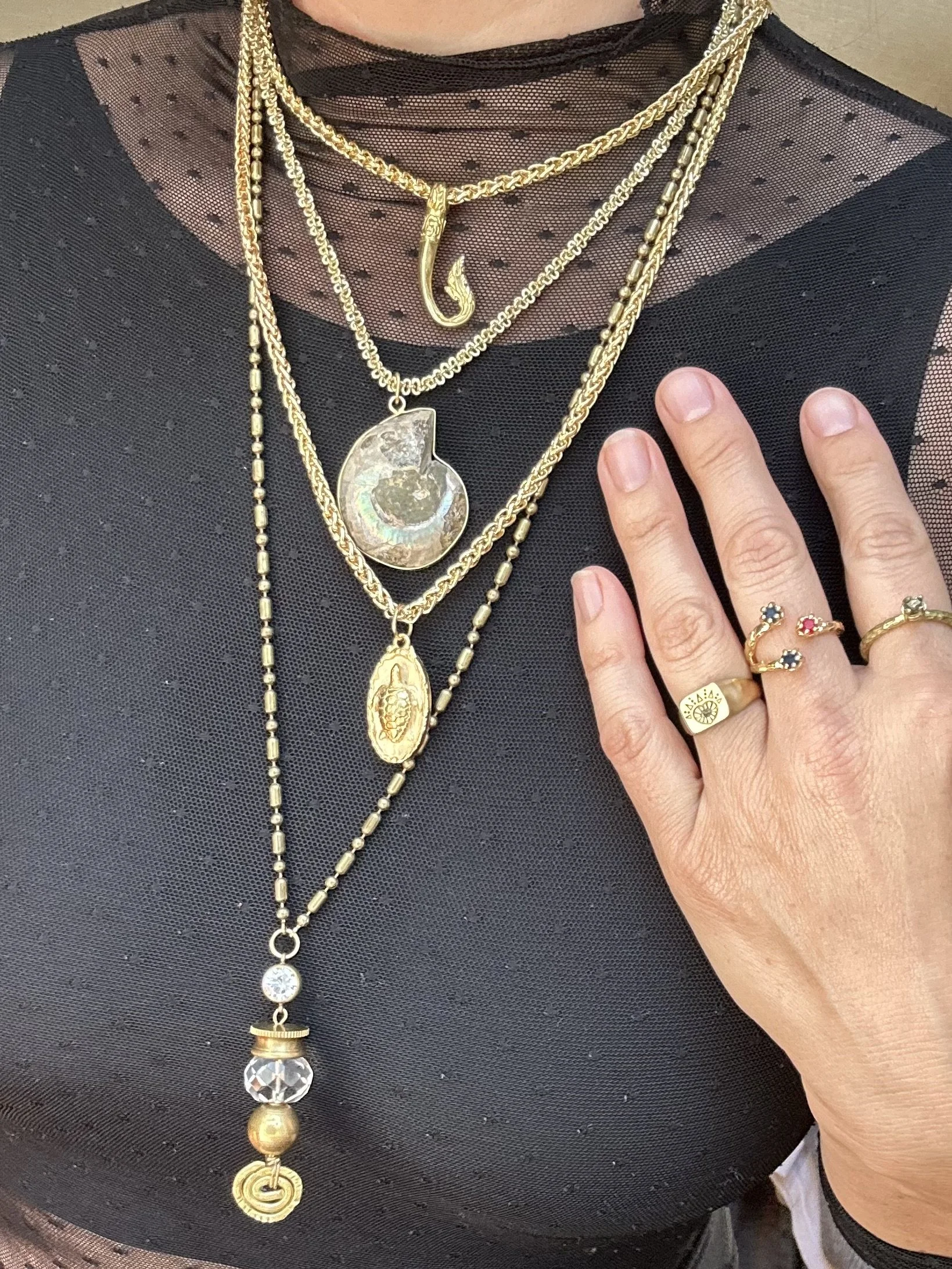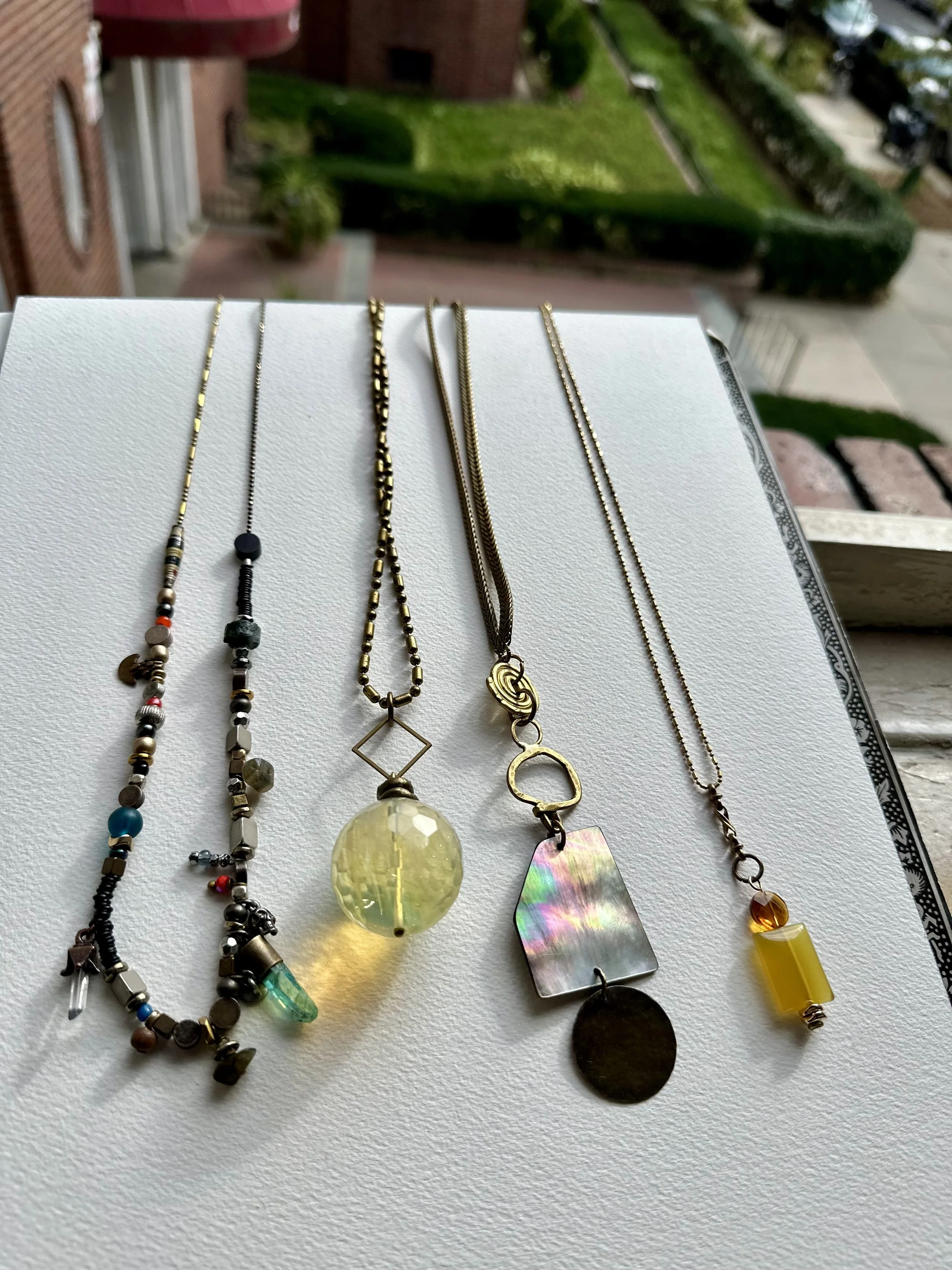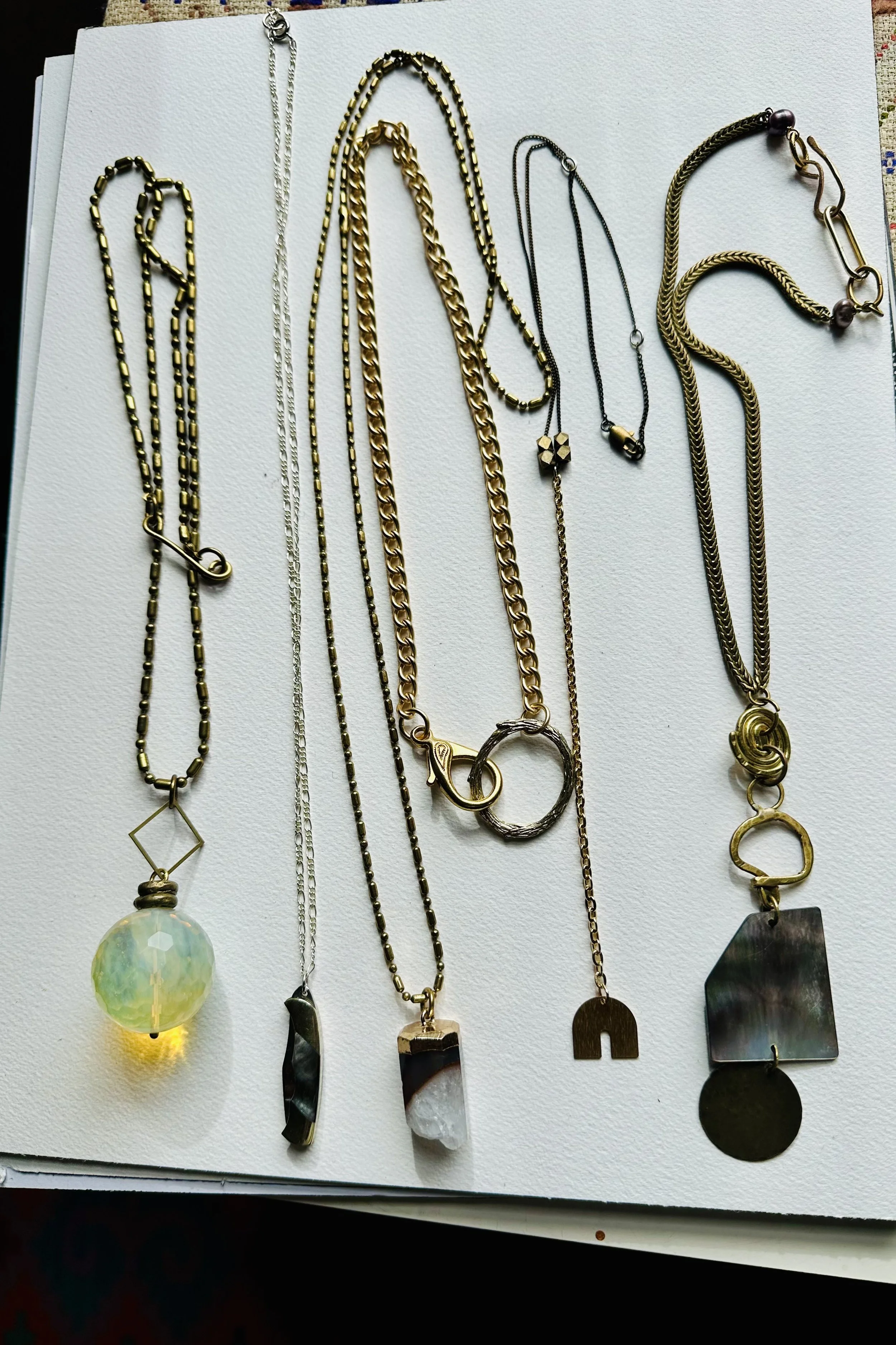Pineapple Quartz Orb Necklace $65.00 Add To Cart Added! Amethyst Barrel Necklace $65.00 Add To Cart Added! rainbow gemstone arc necklace $50.00 Add To Cart Added! white, gold and peach geode beaded necklace $130.00 Add To Cart Added! luxe stone charm necklace $140.00 Add To Cart Added! three layering wand necklaces $120.00 Add To Cart Added! cz bling barrel and hook antique brass necklace $40.00 Add To Cart Added! serpentine jade disc necklace ii. $60.00 Add To Cart Added! brass horseshoe with textured bars necklace $65.00 Add To Cart Added! silver bling ring chain $65.00 Add To Cart Added! Lapis, Tiger Eye & Red Jasper Fan Necklace $50.00 Add To Cart Added! Bronze collected stick & ball chain necklace $86.00 Add To Cart Added! double lapis lazuli antiqued filigree cage necklace $60.00 Add To Cart Added! crescent moon lariat $50.00 Add To Cart Added! black enamel antique knife necklace $75.00 Add To Cart Added! Cz & Crystal Spiral Elongate Stack Necklace $86.00 Add To Cart Added! Double Stone Drop Turquoise Carnelian Necklace $60.00 Add To Cart Added! silver circle chain $40.00 Add To Cart Added! Blue Kyanite and Green Agate Ring Necklace $86.00 Add To Cart Added! Sun Burst on Matte Gold Chain $60.00 Add To Cart Added! Circle Golden Layering Duo $120.00 Add To Cart Added! Abalone Shield with Brass Spiral Shapes Woven Necklace $130.00 Add To Cart Added! Little Yellow Agate and Topaz Necklace $45.00 Add To Cart Added! Playful Eclectic Strung Necklace $86.00 Sold out Sold Out Added! GOLDEN Sculptural Void Necklace $75.00 Add To Cart Added! huge hammered hoop necklace $50.00 Add To Cart Added! Golden dimpled circle and brass weight pendant $60.00 Add To Cart Added! kyanite lariat dramatic brass and hematite beaded necklace $84.00 Add To Cart Added! Circle Front Calligraphy Clasp Chain $65.00 Add To Cart Added! organic gold pods smile chain $50.00 Add To Cart Added! ABALONE INLAID POCKET KNIFE NECKLACE from $80.00 Select Color pink multi-colored Both Add To Cart Added! Solid marked circle pendant $50.00 Sold out Sold Out Added! Ammonite on Wave Chain $65.00 Add To Cart Added! tiny anatomical heart $65.00 Add To Cart Added! serpentine jade disc necklace $60.00 Sold out Sold Out Added! Seafoam Lighthouse with Starbust Beaded Array $80.00 Add To Cart Added! AMMONITE ON GOLDEN SQUIGGLE CHAIN $80.00 Add To Cart Added! D-Ring Brass Structure Necklaces from $60.00 Select Size big small both Add To Cart Added! ametrine and pietersite stacked delicate necklace $64.00 Add To Cart Added! hook horn on woven chain $50.00 Add To Cart Added! blue cracked agate beaded orb necklace $45.00 Add To Cart Added! hand forged front large clasp mixed chain $45.00 Add To Cart Added! Vintage elizabethian chain collar $64.00 Add To Cart Added! Fleur-de-Lis Golden Necklace $40.00 Add To Cart Added! woven chain with golden turtle pendant $65.00 Add To Cart Added! matte chain with huge toggle clasp $65.00 Sold out Sold Out Added! tiny wire-wrapped raw emerald $50.00 Add To Cart Added! faceted onyx elongated lighthouse necklace $78.00 Add To Cart Added! purple glass rectangle necklace $40.00 Add To Cart Added! bold yellow agate spears ii $65.00 Sold out Sold Out Added! yellow agate watch chain lariat necklace $75.00 Add To Cart Added! sterling silver spiral chain lariat $80.00 Add To Cart Added! sterling silver spiral chain with t-bar $80.00 Sold out Sold Out Added! cloisonne vintage fish clasp-add-on circle chain necklace $80.00 green blue Add To Cart Added! mesh chain with blingy stone altar $88.00 Sold out Sold Out Added! bold steel railroad chain with connector rings $54.00 Add To Cart Added! super long freshwater pearl strand $120.00 Add To Cart Added! green agate ring and pink lighthouse necklace $70.00 Add To Cart Added! red agate rhombus necklace $65.00 Sold out Sold Out Added! magical elixir gemstone beaded necklace $120.00 Add To Cart Added! tiny textured t-bar chain $40.00 Sold out Sold Out Added! quartz and carnelian orb delicate layering necklaces $60.00 Sold out Sold Out Added! vintage solid bejeweled squirrel necklace $80.00 Sold out Sold Out Added! wavy chalcedony collar $65.00 Add To Cart Added! heart burst with hand-forged clasp iii. $68.00 Sold out Sold Out Added! Brass Pods Smile Chain $40.00 Add To Cart Added! Lapis Lazuli Spears with Dramatic Chain $75.00 Sold out Sold Out Added! triple wand on luxe chain $82.00 Sold out Sold Out Added! YELLOW QUARTZ WAND TORTOISE RING PURPLE CHAIN $55.00 Add To Cart Added! blue dip dyed rope yellow glass and wooden columns necklace $95.00 Sold out Sold Out Added! fluorite and yellow onxy points ft brass square pendant duos $60.00 Add To Cart Added! crushed red agate shield pendant $55.00 Add To Cart Added! antique silver zipper lariat necklace $50.00 Add To Cart Added! TWO ANTIQUE KEYS LAYERING NECKLACES iii. $86.00 Add To Cart Added! Textured Circle Front Clasp Chain $60.00 Sold out Sold Out Added! magenta and carnelian crystal collar $68.00 Sold out Sold Out Added! Golden Bundle; 3 necklaces $144.00 Sold out Sold Out Added! Abalone Square Stack with Beaded Elegance Necklace $65.00 Add To Cart Added! Aqua Terra and Red Creek Jasper Fan Necklace $86.00 Sold out Sold Out Added! brass t-horn necklace $55.00 Add To Cart Added! Sun Burst with Front Clasp Chain Necklace $68.00 Sold out Sold Out Added! Opalite Lighthouse Necklace $75.00 Add To Cart Added! Stone Curiosity Cabinet Necklace $125.00 Add To Cart Added! Rough Black Tourmaline with Dalmatian Jasper Ring $80.00 Add To Cart Added! Huge rough cut clear quartz necklace $60.00 Add To Cart Added! heart burst on paperclip chain $60.00 Sold out Sold Out Added! tiny freshwater pearl drop $50.00 Sold out Sold Out Added! front hammered hoop and hand-forged clasp necklace $55.00 Sold out Sold Out Added! vintage coin and moonstone on luxe bow knot chain $75.00 Add To Cart Added! wavy ring dimple brass handmade mixed metal chain $68.00 Add To Cart Added! Crushed Pyrite and Golden Quartz Shield Necklace $86.00 Add To Cart Added!